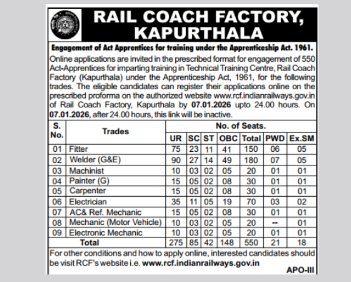 - Age Relaxation as per RCF Kapurthala Apprentice Apprentice Recruitment Rules.